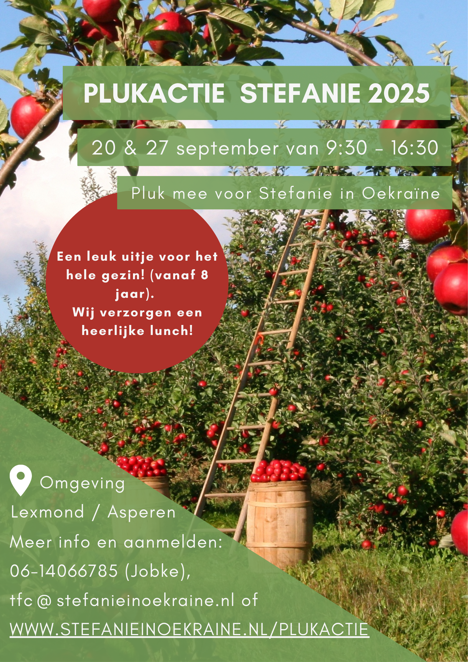 Ook dit jaar mogen we weer appels / peren komen plukken bij Leen en Ciska van Pommeren, in de omgeving Lexmond/Asperen. Het loon wat je verdiend wordt gebruikt om het werk van Yura en Stefanie in Oekraïne te ondersteunen. Afgelopen jaren was het daarnaast ook nog eens enorm gezellig, en daarom herhalen we de actie graag met jullie!