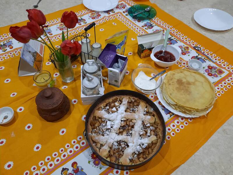 Helaas voor ons geen oranje tompoucen, maar we hebben heerlijk genoten van pannenkoeken en Nederlandse appeltaart.