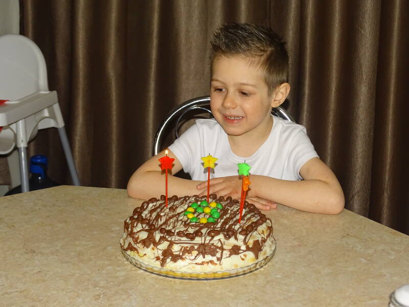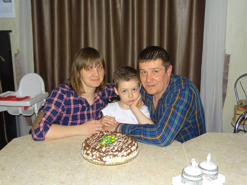 Voor Dima was dit de eerste keer in zijn leven dat hij zijn verjaardag vierde. Hij had totaal niet uitgekeken naar deze dag, omdat hij niet wist wat jarig zijn nu eigelijk is. Tot zijn 4e jaar woonde hij in hele slechte omstandheden bij zijn moeder. Daarna heeft hij bijna een jaar in kindertehuis gewoont, waar hij ook bijna geen liefde en aandacht heeft gekregen. En nu mag hij inmiddels al 3 maanden wonen in het gezin van Andre en Alona. Nu mag hij een vader en moeder hebben die van hem houden.