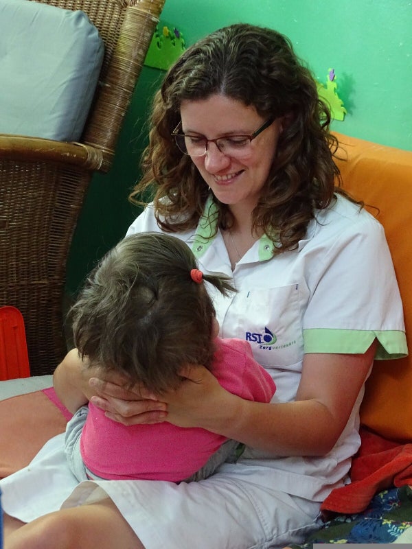 Na 20 minuutjes rijden kwamen we aan op het zigeunerkamp in een klein dorpje. Moeder werd gehaald en kwam naar ons toe lopen. Moeder zou haar kind na een jaar weer zien. Moeder leek te schrikken toen ze Ludmilla zag. Ze vroeg of Ludmilla ziek was. Een zuster (die mee was) vertelde dat Ludmilla niet ziek is maar dat ze niet kan zitten, staan, kijken en horen. We gaven Ludmilla in de armen van moeder. Na nog een uitleg dat Ludmilla alleen gepureerd eten eet en dat ze elke dag medicijnen moeten geven voor haar epilepsie, liep moeder met Ludmilla en de rest van de familie weer terug het kamp in.