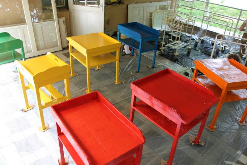 Een aantal dagen geleden zijn wij begonnen met het opknappen van de kinderkamer. In het ziekenhuis zijn er twee kinderkamers. Eén kinderkamer is vorig jaar al opgeknapt. Nu is deze kamer aan de beurt. Per dag werken er twee vrijwilligers aan de kinderkamer en de andere twee vrijwilligers zorgen voor de kinderen. Alle bedjes en verschoningstafels moeten worden geschuurd en geverfd. De kinderkamer krijgt mooie vrolijke kleurtjes. Zelfs de muren mogen mooi beschilderd worden, zodat het een echte kinderkamer wordt. We zijn heel benieuwd hoe het eruit ziet als het klaar is!